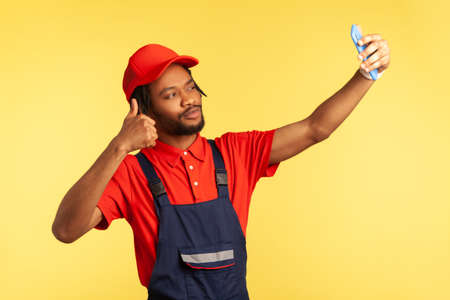 Handsome worker with beard wearing uniform having video call with client, showing thumb up, talking about perfect job, execute order. Indoor studio shot isolated on yellow background.