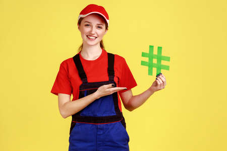 Portrait of worker woman standing presenting green hashtag in hands, looking at camera with positive expression, wearing overalls and red cap. Indoor studio shot isolated on yellow background.