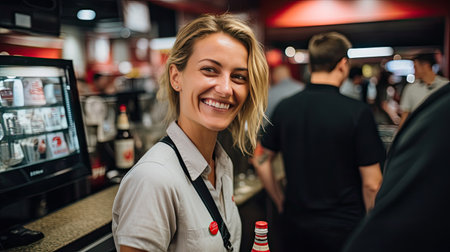 Smiling woman serving a cashier in a supermarket, satisfied worker. AI Generated.