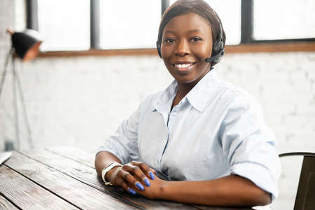 African-American office worker businesswoman with a pleasant smile in headset looking at the camera, sitting at the desk. Female call center operator is feeling motivated and ready to work