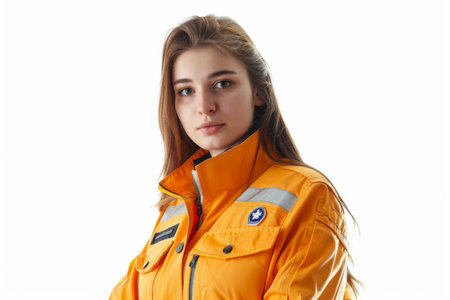 A determined young woman stands proudly in a vibrant orange safety jacket, symbolizing courage and readiness. The clean white background highlights her strong presence and commitment to safety.