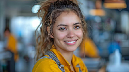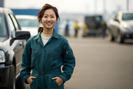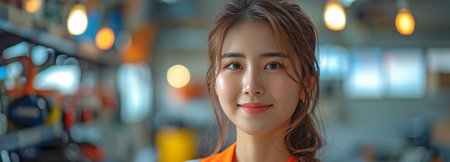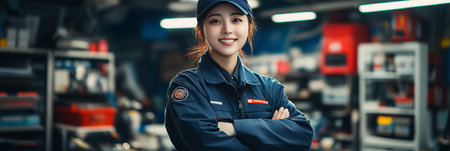 Asian female auto mechanic smiles with confidence in car workshop.