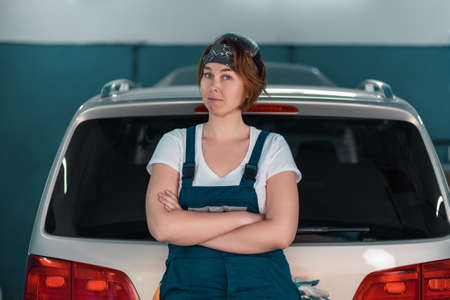 Portrait of caucasian young woman in a blue coveralls posing crossed arms by a car. Concept of work in an auto repair shop.
