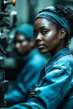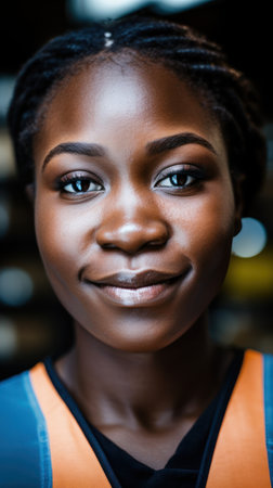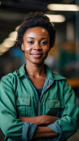 African woman in her 30s, smiling, happy, working in a factory