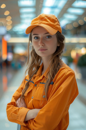 Caucasian female cleaner in uniform looking at camera with confidence in shopping mall.