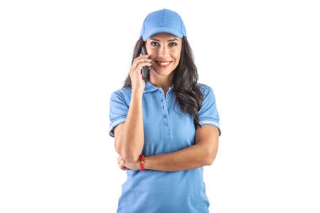 Attractive dark-haired delivery woman in blue uniform calling to a customer. Isolated white background.