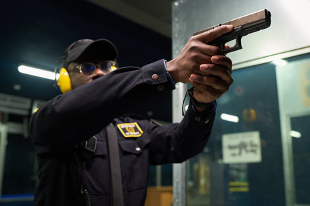 Man practicing shooting at indoor gun range, focusing on target while wearing protective gear. Skillfully handling firearm in controlled environment