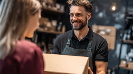 A cheerful man delivers a package to a woman in a charming retail space, highlighting the warmth of customer service and the joy of personal interactions in shopping.