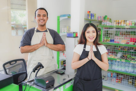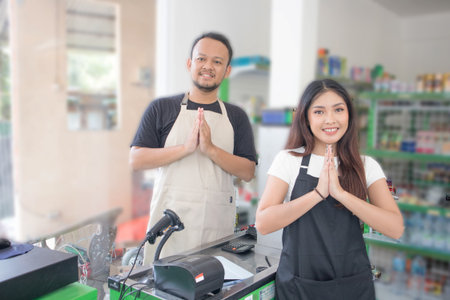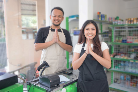 couple Asian cashier welcoming customer with open arms, cashier is wearing black and cream apron standing in a groceries or convenient store