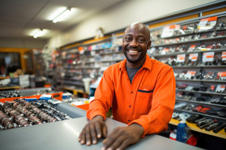 An upbeat salesman showcases various auto goods, his friendly demeanor ensuring a delightful shopping experience for car enthusiasts