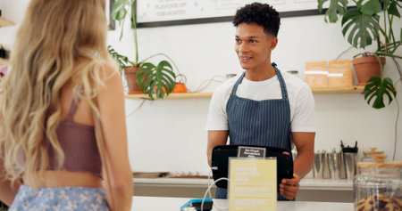 Service, barista or customer order at cafe for food or help at table in a coffee shop job with menu. Listening, waiter or employee in small business restaurant talking a woman, lady or girl client