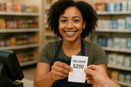 Cashier handing over a receipt highlighting 200 in savings to a satisfied customer during a busy supermarket checkout experience