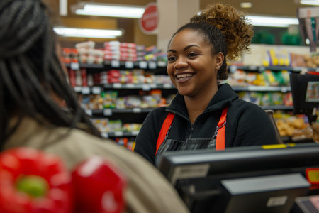 Cheerful female cashier interacts with a customer during checkout in a supermarket aisle
