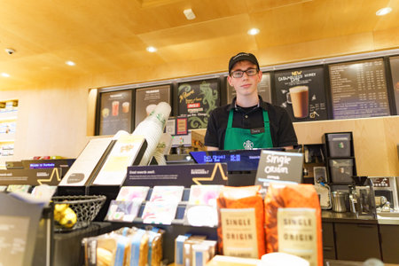 NEW YORK - CIRCA MARCH 2016: worker at Starbucks Cafe. Starbucks Corporation is an American global coffee company and coffeehouse chain based in Seattle, Washington