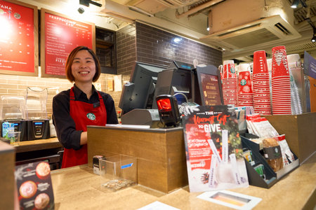 HONG KONG - CIRCA NOVEMBER, 2016: staff at a Starbucks cafe in Hong Kong. Starbucks Corporation is an American coffee company and coffeehouse chain.