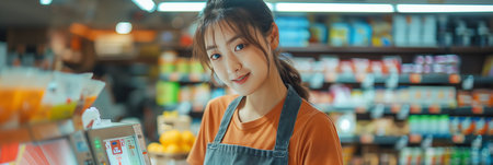 Asian female cashier working with merchandise in convenience store.
