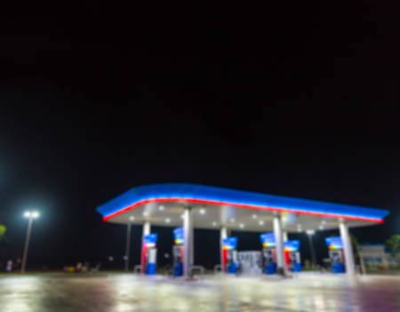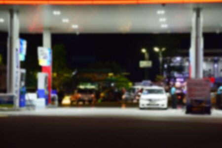 The blurred image of a car being fueled at a gas station. Absract blur petrol gas station in night background with light bokeh
