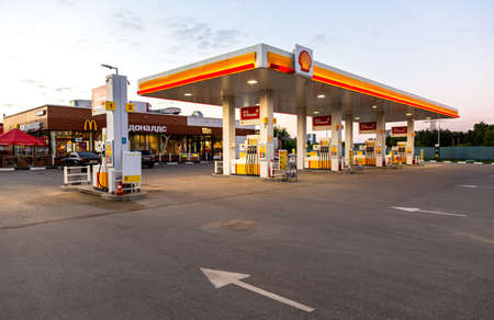 Ryazan, Russia - July 6, 2021: Shell gas station in evening. Shell V-power fuel station. Royal Dutch Shell is an Anglo-Dutch multinational oil and gas company