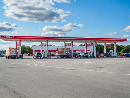 Voronezh region. Russia. July 23, 2021. A gas station in corporate red and white colors of Lukoil on a sunny summer day. Many cars fill up with fuel at the gas station.