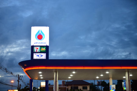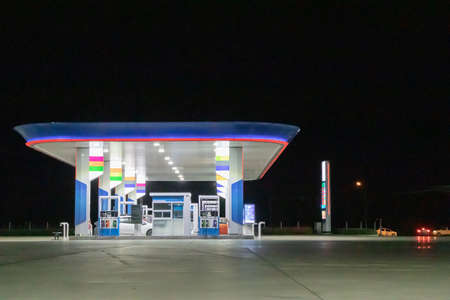 Rayong,Thailand, August 10 ,2019, Night PTT Station,Gas Station PTT is the most popular in Thailand.