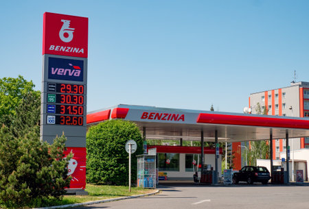 OSTRAVA, CZECH REPUBLIC - MAY 5, 2018: The red petrol station of local Benzina company. The image was taken in Ostrava - Poruba, Czech republic on May 5, 2018.