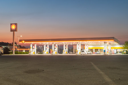 Fushe, Kosovo - June 5, 2022: Shell gas station at sunrise. Royal Duch Shell is the largest oil company in the world.