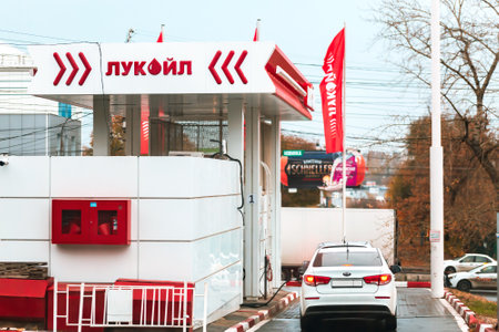Saratov, Russia - 01/11/2020: Lukoil fuel station, the car is refueled with gasoline petrol.