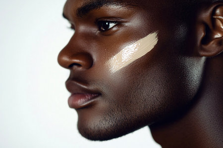 African young male with skincare product on cheek close-up.