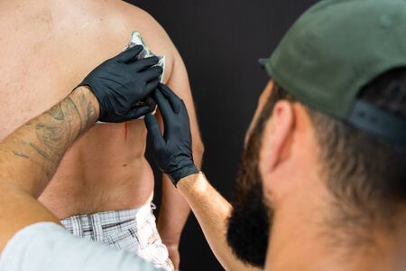 Professional tattoo artist putting picture for tattooing on the customers back to copy it for the work at salon studio