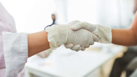 Doctor and patient meeting concept. concept. Cropped close-up photo of woman and man wearing gloves greet each other by shaking hands isolated on turquoise blue white background