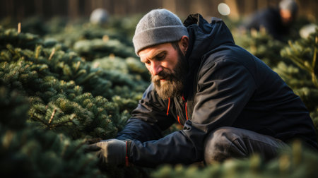 A dedicated man meticulously pruning an organically grown Christmas tree on a tranquil farm. Emphasizing sustainable agriculture and holiday preparation.