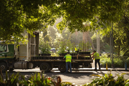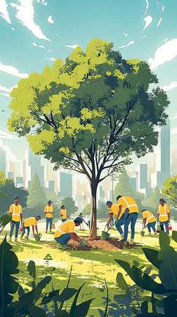A dedicated group of volunteers is planting a tree in a vibrant city park setting, promoting community and sustainability. The lush greenery contrasts beautifully with the urban skyline.