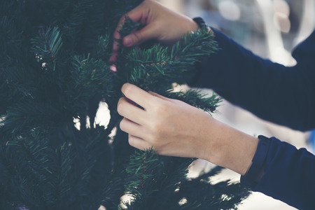 Closeup of Christmas tree. Christmas and New Year holiday background. Vintage color tone