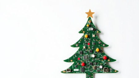 IT Christmas tree made of microcircuits, boards and wires over white background. Technology banner with copy space. Greeting card for sysadmin or engineer for Xmas and New Year holidays celebration