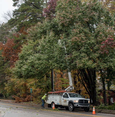 Carrboro, North Carolina, US-November 13, 2018: Workers repairing power lines after tree fell on them in storm