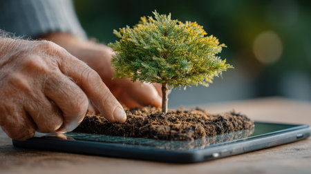 A close up of hands planting small tree on digital tablet screen representing sustainability and business growth with creative social media concept