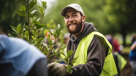 Dedicated Volunteers Working Together to Plant Young Trees in a Lush Forest Environment