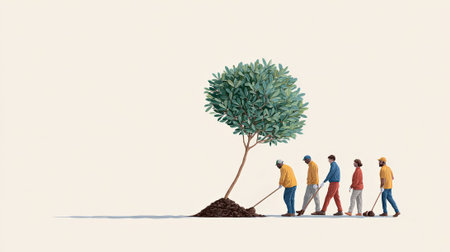 Tiny figures work diligently around a large tree, tending to the soil and its roots