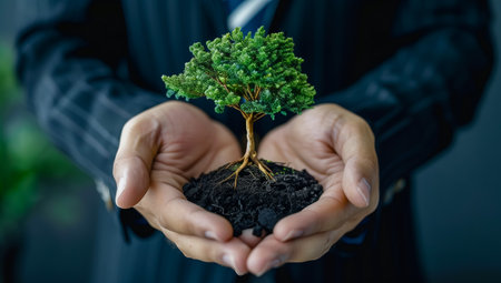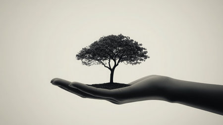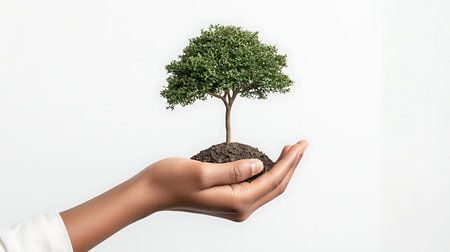 A close-up shot of a hand cradling a small tree, conveying themes of care, growth, and environmental consciousness.