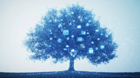 A creative illustration of a digital tree adorned with various technology and communication icons, symbolizing growth, connectivity, and innovative ideas in a modern world.