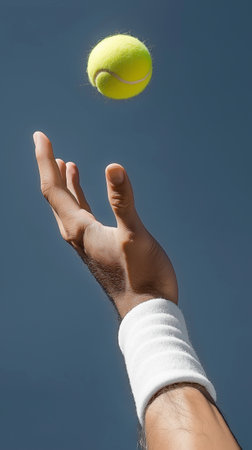 Serving ball. Close-up of male hand in wristband throwing tennis ball against blue sky. Playing sports, healthy lifestyle, physical activity, training, active lifestyle, competition, Preparation for big sports.