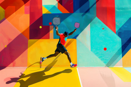 A man standing on a tennis court holding a tennis racquet, A colorful abstract representation of a vegan diet