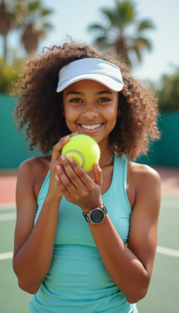 A cheerful young woman with curly hair poses confidently on a tennis court, holding a bright yellow tennis ball. Her vibrant energy and sunny smile radiate joy, embodying the spirit of sports and outdoor fun.