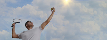 Man serving ball while playing tennis outdoors, low angle view. Banner design with space for text