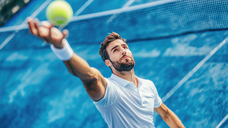 A tennis player mid-serve, tossing the ball into the air and preparing to strike with full focus, with the blue tennis court and net in the background.