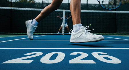 Dynamic low-angle view of an athlete's legs in motion on a vibrant blue tennis court, featuring the year 2026 prominently displayed, with a tennis match unfolding in the distance.