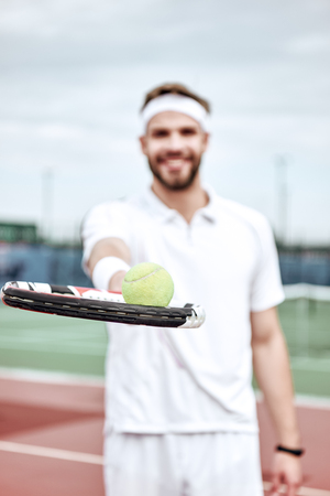 Portrait of tennis player man. Front view. Looking at camera. on the court