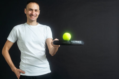 Tennis ball in the hand of a man on a blue background