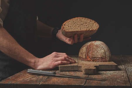 Fresh delicious bread in the hands of a male baker close-up. Freshly baked sourdough bread with a golden crust on a wooden board. The context of a bakery with delicious bread. confectionery products.