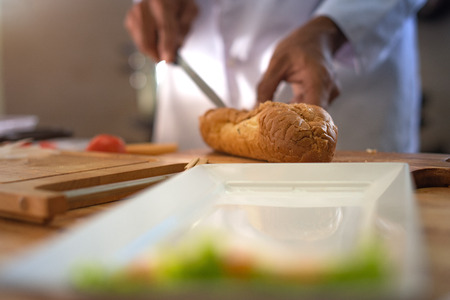 Close-up of chef's hands cutting whole grain bread with a knife on a wooden table. Concept of healthy eating and traditional bakery. Selective focus